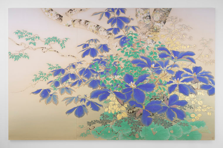 Shigemi Yasuhara (b. 1984 in Aichi, Japan) addresses with solemnity, the most popular subject of Nihonga: nature. Working on a signature butter-yellow background, Yasuhara depicts the branch of a tree, a vine, or a landscape in pitch perfect brush strokes and delicate colors. The paintings are fresh and captivating with the pure joy that nature paintings can offer.