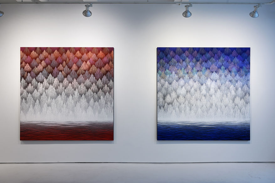 On the occasion of his first major solo exhibition outside of Japan, Izumi presents his signature “Hour” series. These landscape works are composed of obsessively detailed repetitions of white trees against a background of vivid ultramarine, crimson or oxidized gold leaves. With this series, Izumi challenges the notion of naturalism, typically a preferred subject of Nihonga artists. “Nature has a perfect beauty and I don’t find it interesting to merely copy it in my painting,” says Izumi. “I pursue new beauty by eliminating randomness and creating patterns from a single motif and then simplifying elements I find in nature.”